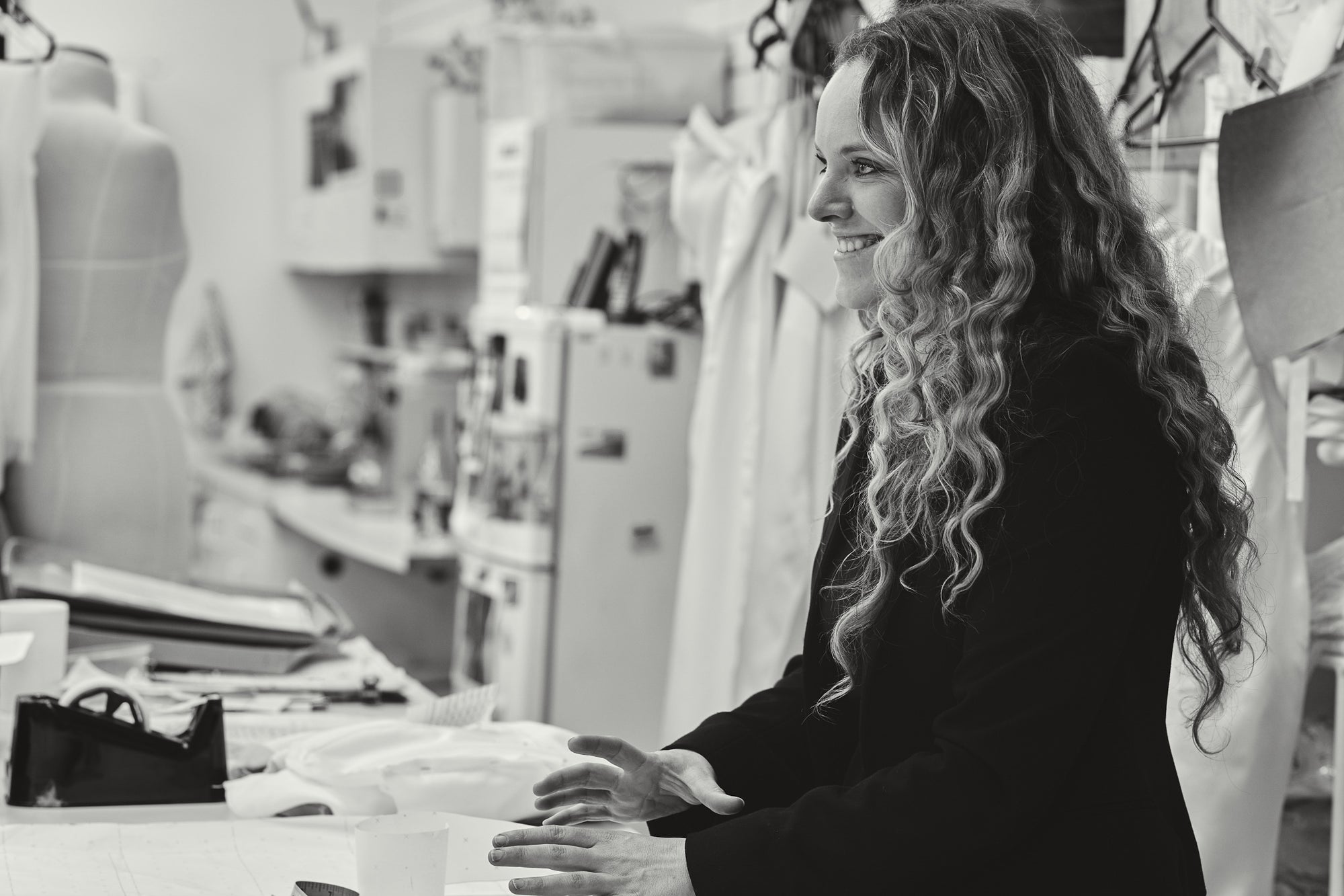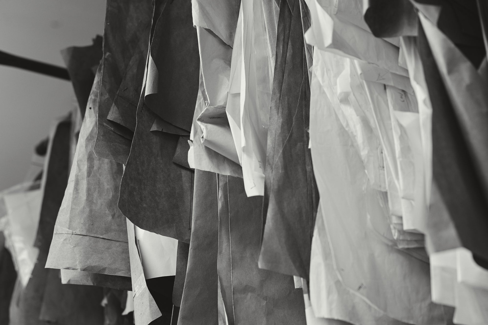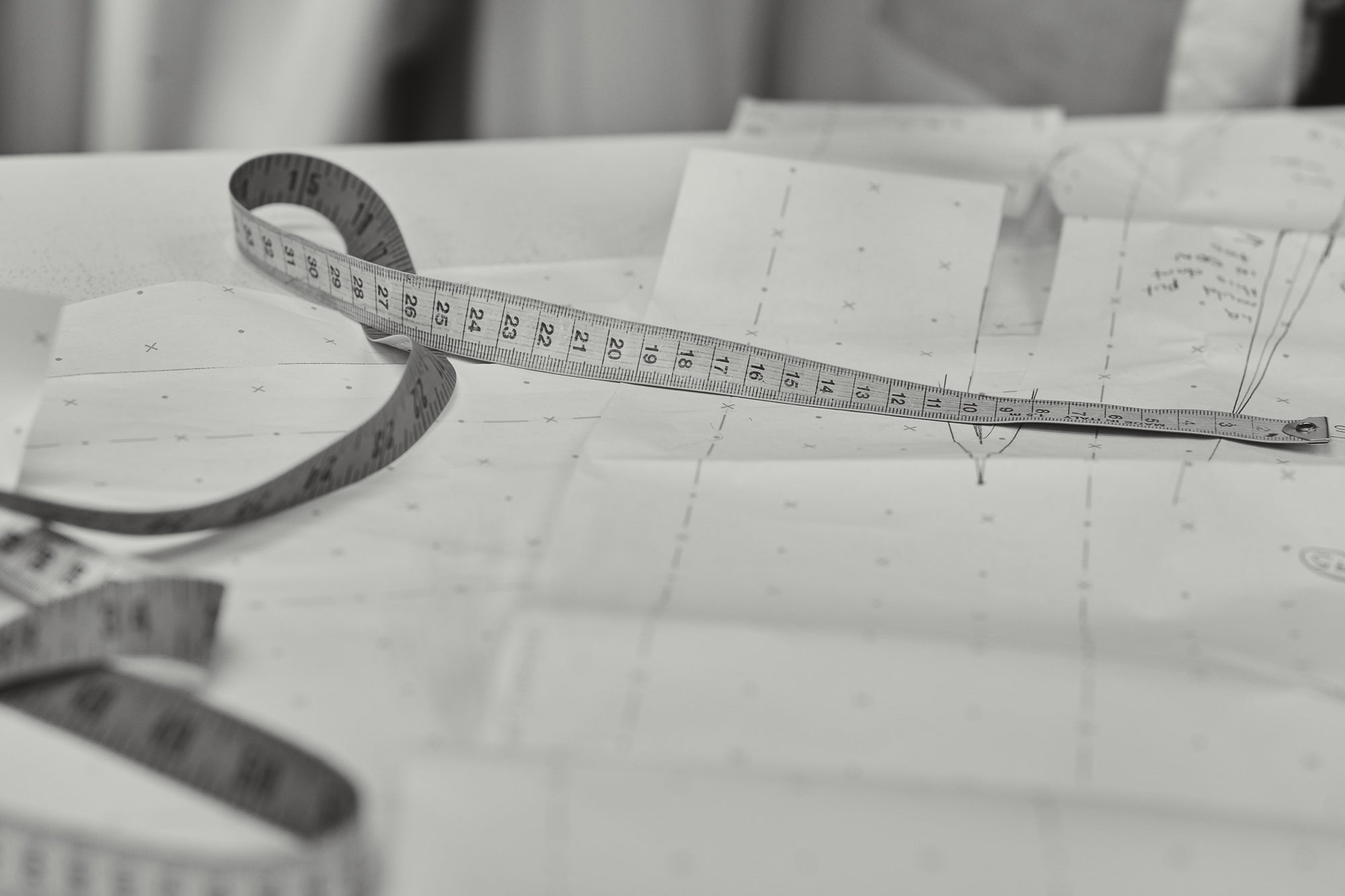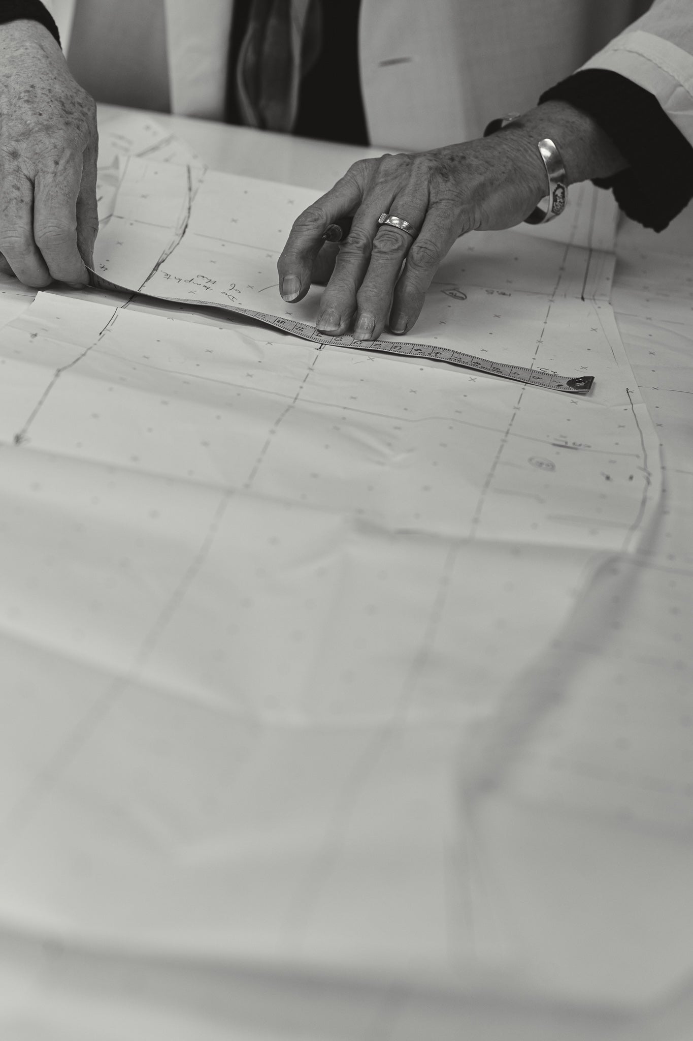 Meet with our Master Patternmaker for precise measurements and technical specifications. Your custom pattern is crafted and cut in calico, forming the first “toile”—a mock-up of your gown. At your initial toile fitting, we assess fit, design lines, and special features, making adjustments to perfect the foundation of your dress. The pattern is then refined, and the gown begins to take shape in our workroom.